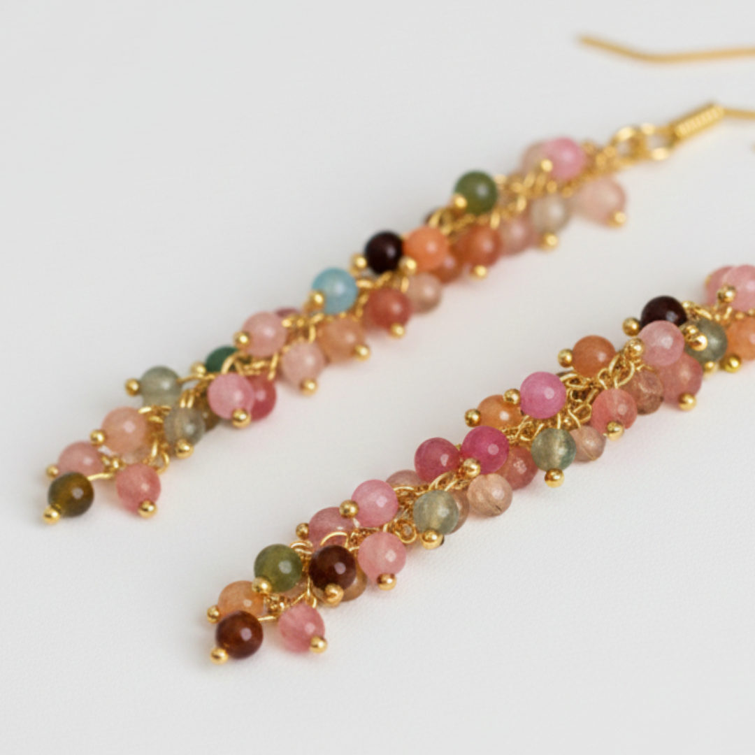 Los pendientes Amalia son una explosión de color y movimiento. Confeccionados con delicadas bolitas rojas que cuelgan en cascada sobre un gancho dorado, están diseñados para realzar cualquier look con un toque de alegría y sofisticación. Son ese tipo de pendiente que transforma un recogido sencillo en algo memorable.