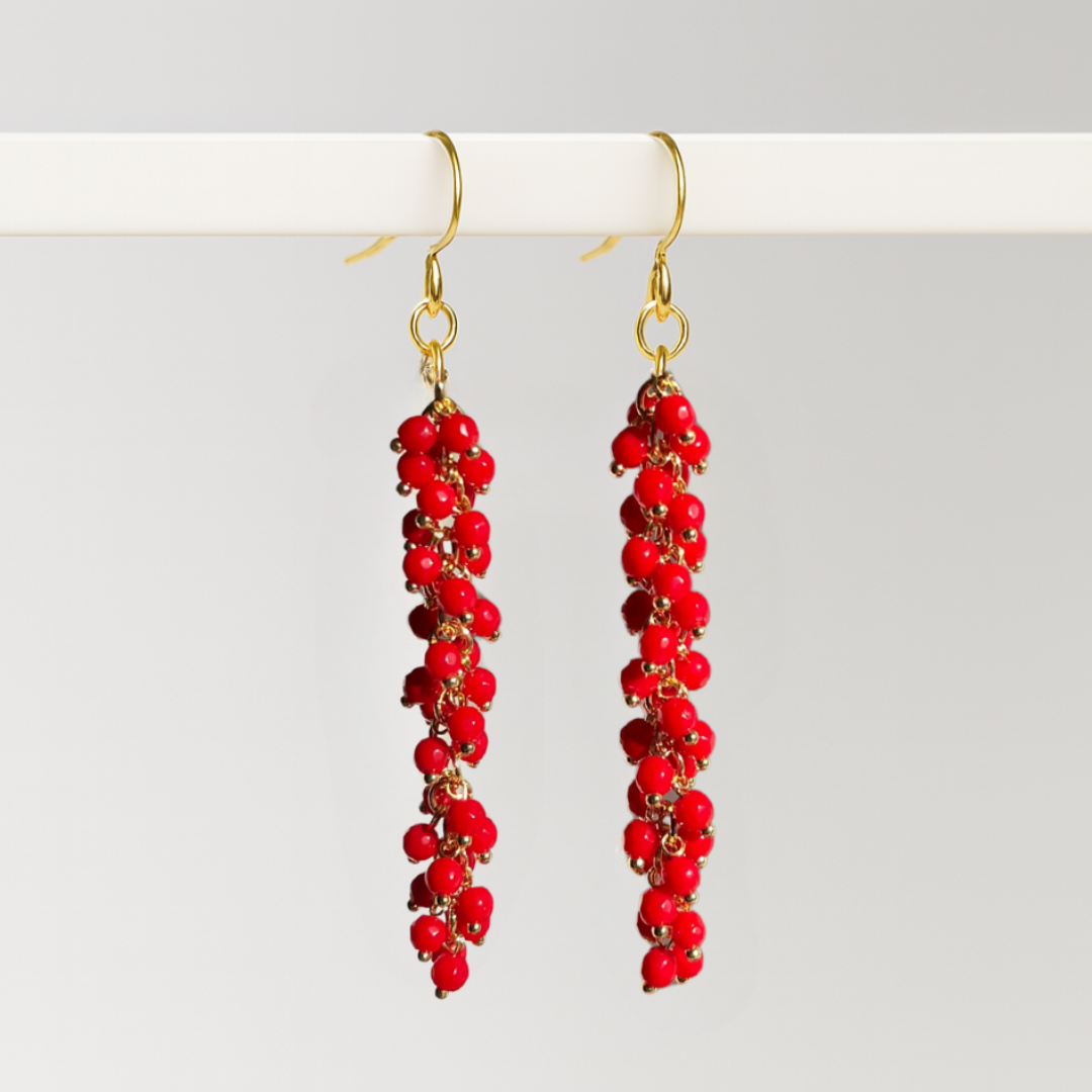 Gli orecchini Amalia sono un'esplosione di colore e movimento. Realizzati con delicate perle rosse che scendono a cascata da un gancio dorato, sono pensati per impreziosire qualsiasi look con un tocco di gioia e raffinatezza. Sono il tipo di orecchini che trasformano una semplice acconciatura in qualcosa di memorabile.