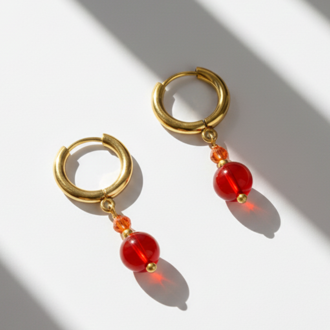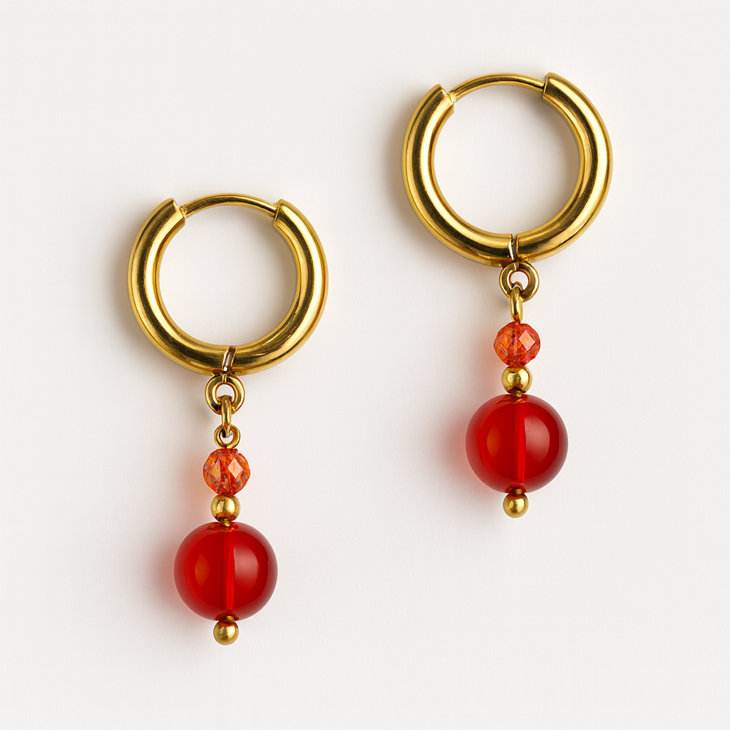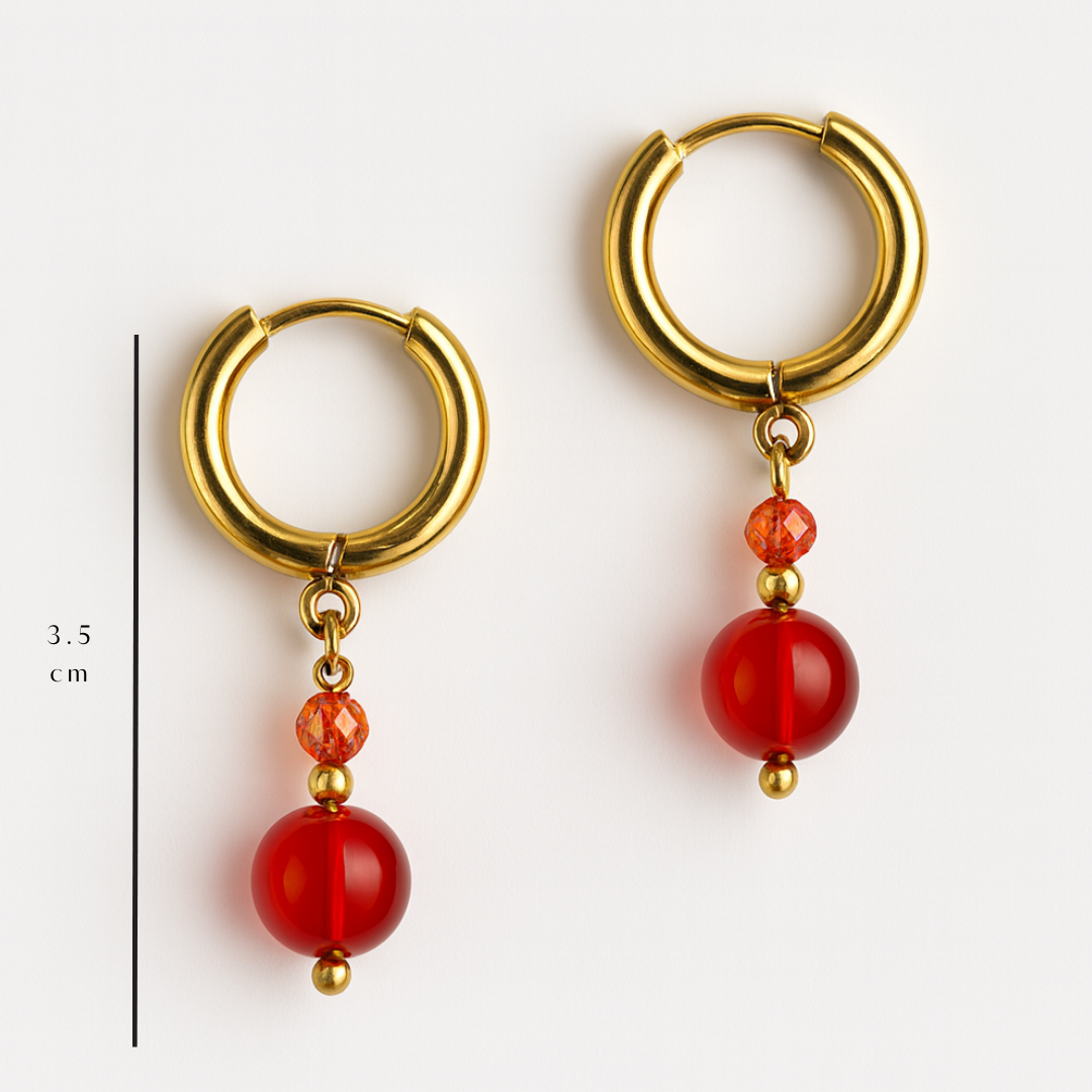 Un diseño luminoso y vibrante que aporta un toque cálido a cualquier look. Los pendientes Celia combinan un aro dorado de acabado pulido con dos cuentas acrílicas facetadas en tonos naranja, creando un efecto radiante y delicado. Ligeros, cómodos y perfectos para el día a día o para elevar un outfit sencillo.