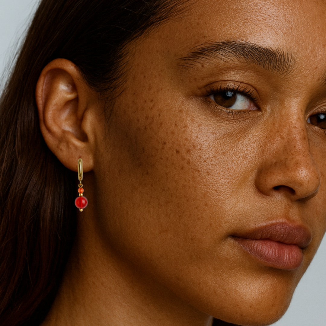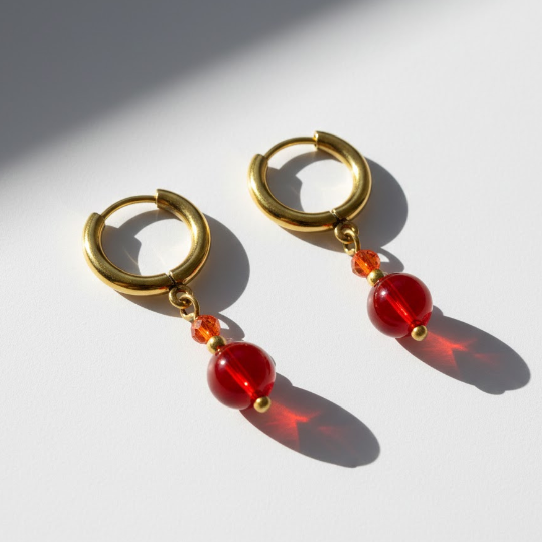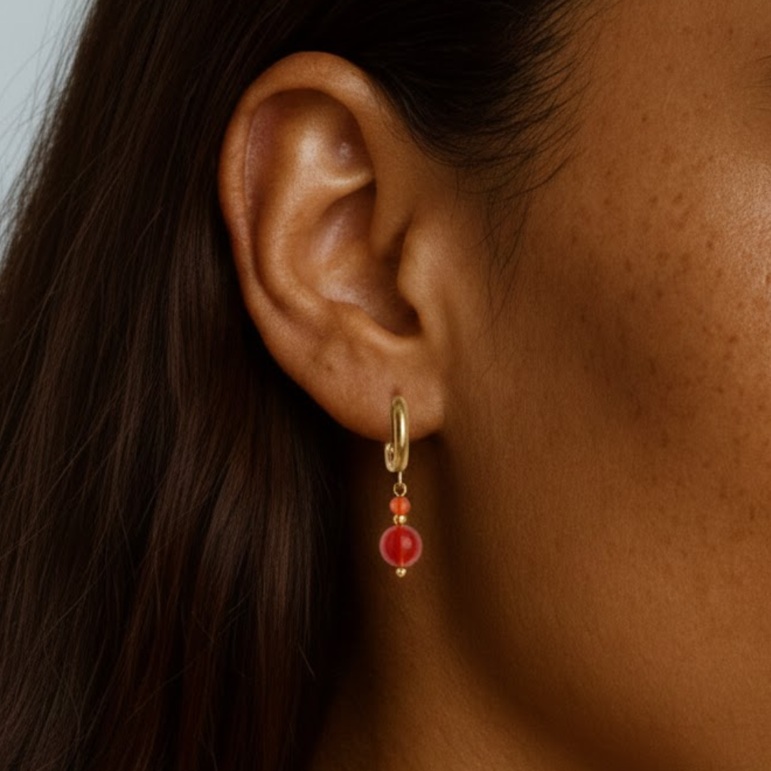 Un diseño luminoso y vibrante que aporta un toque cálido a cualquier look. Los pendientes Celia combinan un aro dorado de acabado pulido con dos cuentas acrílicas facetadas en tonos naranja, creando un efecto radiante y delicado. Ligeros, cómodos y perfectos para el día a día o para elevar un outfit sencillo.