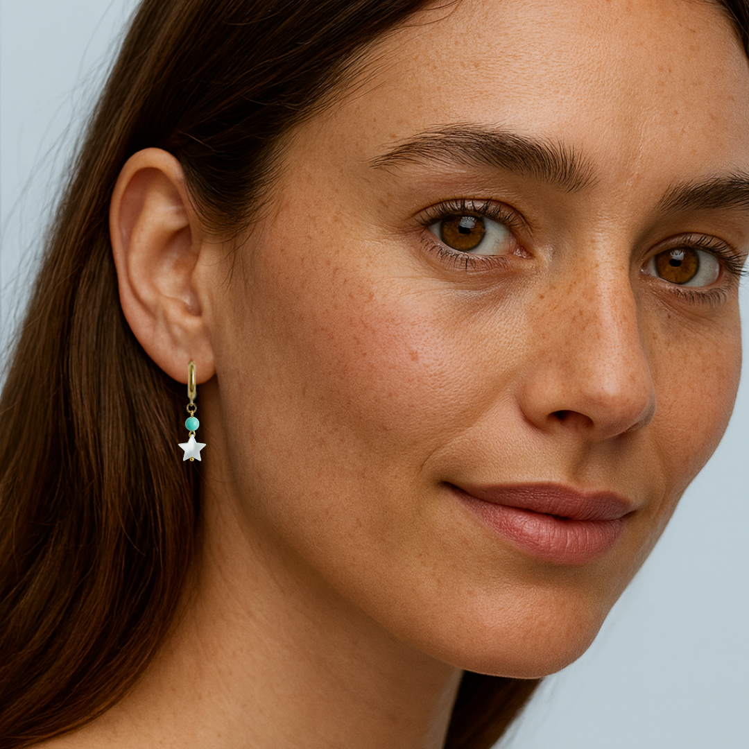 Pendientes con aro dorado y charm de estrella en acabado nácar, combinados con una cuenta azul que aporta un toque fresco y luminoso. Un diseño delicado y versátil para elevar cualquier look diario.