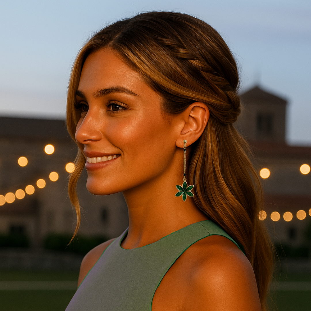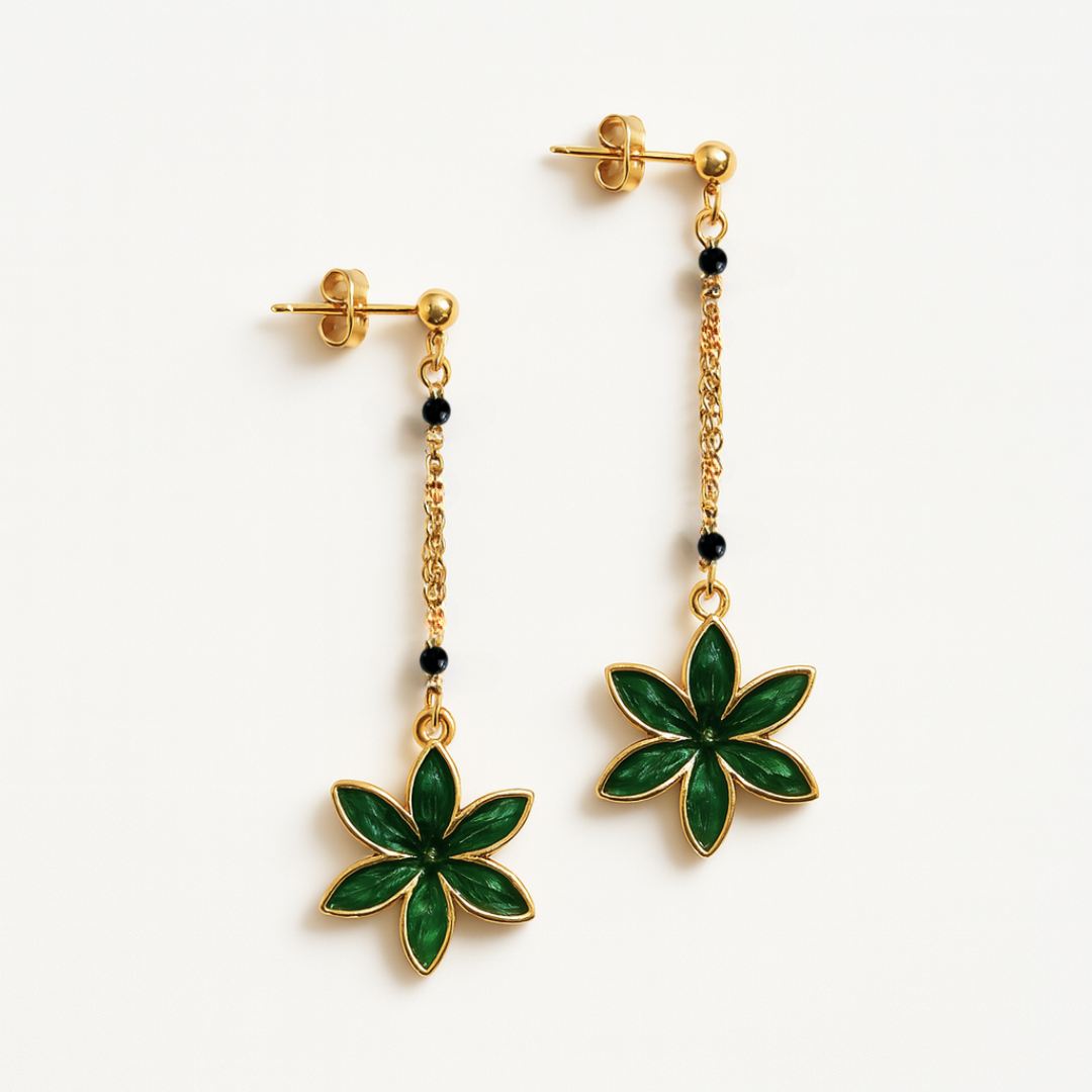 Gli orecchini verdi Gala sono un inno all'eterna primavera. Il loro fiore smaltato delicatamente scintillante e la struttura in oro creano un pezzo armonioso, pieno di colore, gioia e raffinatezza.Con raffinati dettagli a catena e perline abbinate, questo modello dona un movimento elegante al viso e un tocco chic a qualsiasi look: da un abito da sposa a un completo casual con personalità.