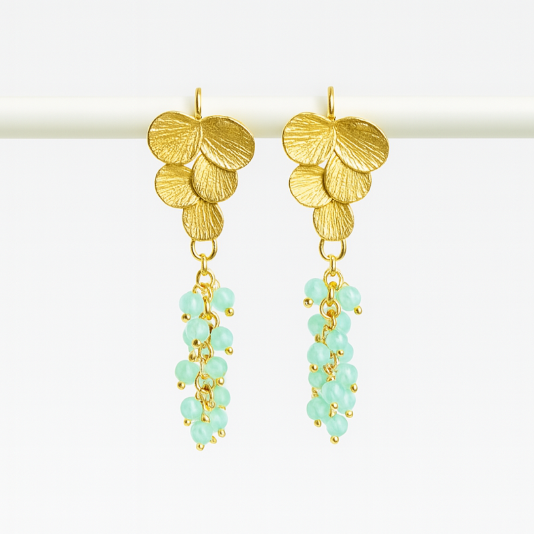 - Design: gruppo di perline verde menta su foglie dorate testurizzate.
