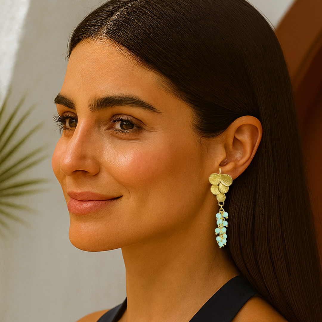 I nostri orecchini Giulia sono pensati per le donne che vogliono distinguersi con eleganza senza rinunciare alla comodità. Le foglie dorate dipinte a mano aggiungono un tocco di raffinatezza, mentre le perle blu a cascata aggiungono un tocco di freschezza e movimento al tuo look.