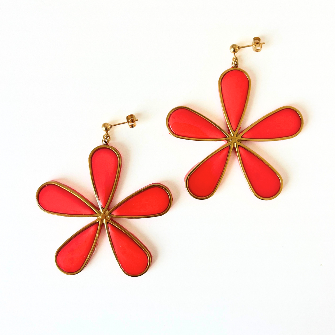 Questi orecchini combinano il fascino artigianale dell'argilla polimerica rivestita in resina con la resistenza dell'acciaio inossidabile . Il loro design floreale ampio e leggero illumina il viso e aggiunge un tocco di allegria, perfetto per matrimoni, eventi speciali o look estivi.