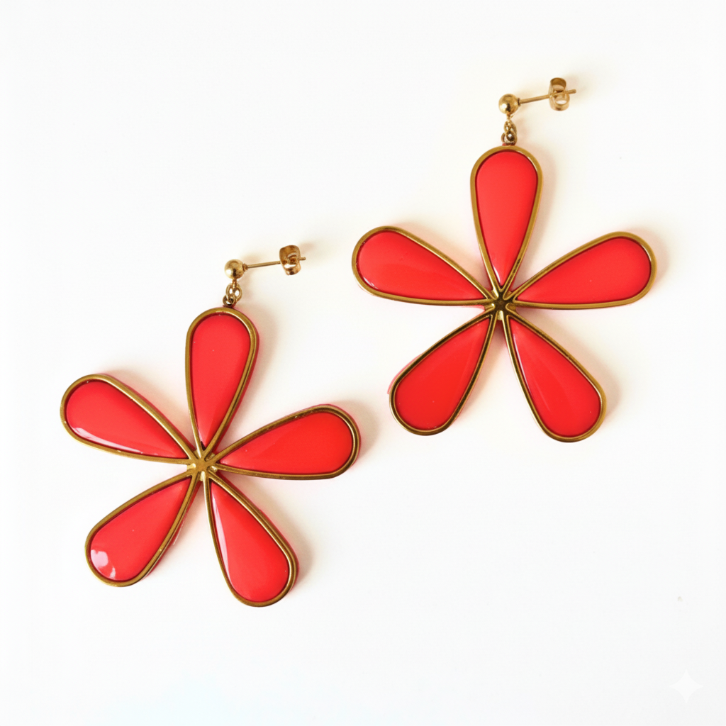 Estos pendientes combinan el encanto artesanal de la arcilla polimérica cubierta de resina con la durabilidad del acero inoxidable. Su diseño floral grande y liviano ilumina el rostro y aporta un toque alegre, ideal para bodas, eventos especiales o looks de verano.