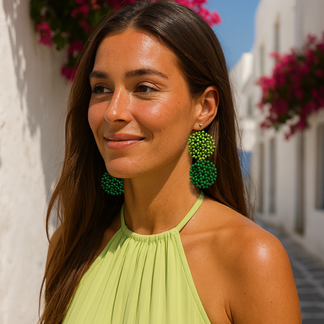 Gli orecchini Kalea sono puro carattere ed energia. Il loro design, composto da due cerchi sovrapposti di perline verde brillante e fresco, è perfetto per chi ama distinguersi con stile. Sono ideali per quei giorni in cui hai bisogno di un tocco di colore che parli di te.