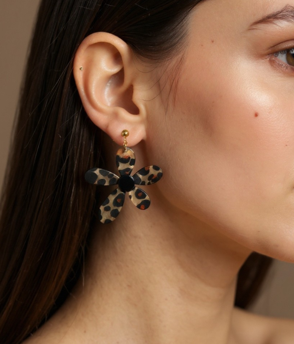 Los pendientes Kora combinan el encanto retro de una flor XL con un estampado animal print en resina brillante que aporta carácter y estilo. Son ligeros, llamativos y perfectos para elevar cualquier look con un toque atrevido y muy actual.