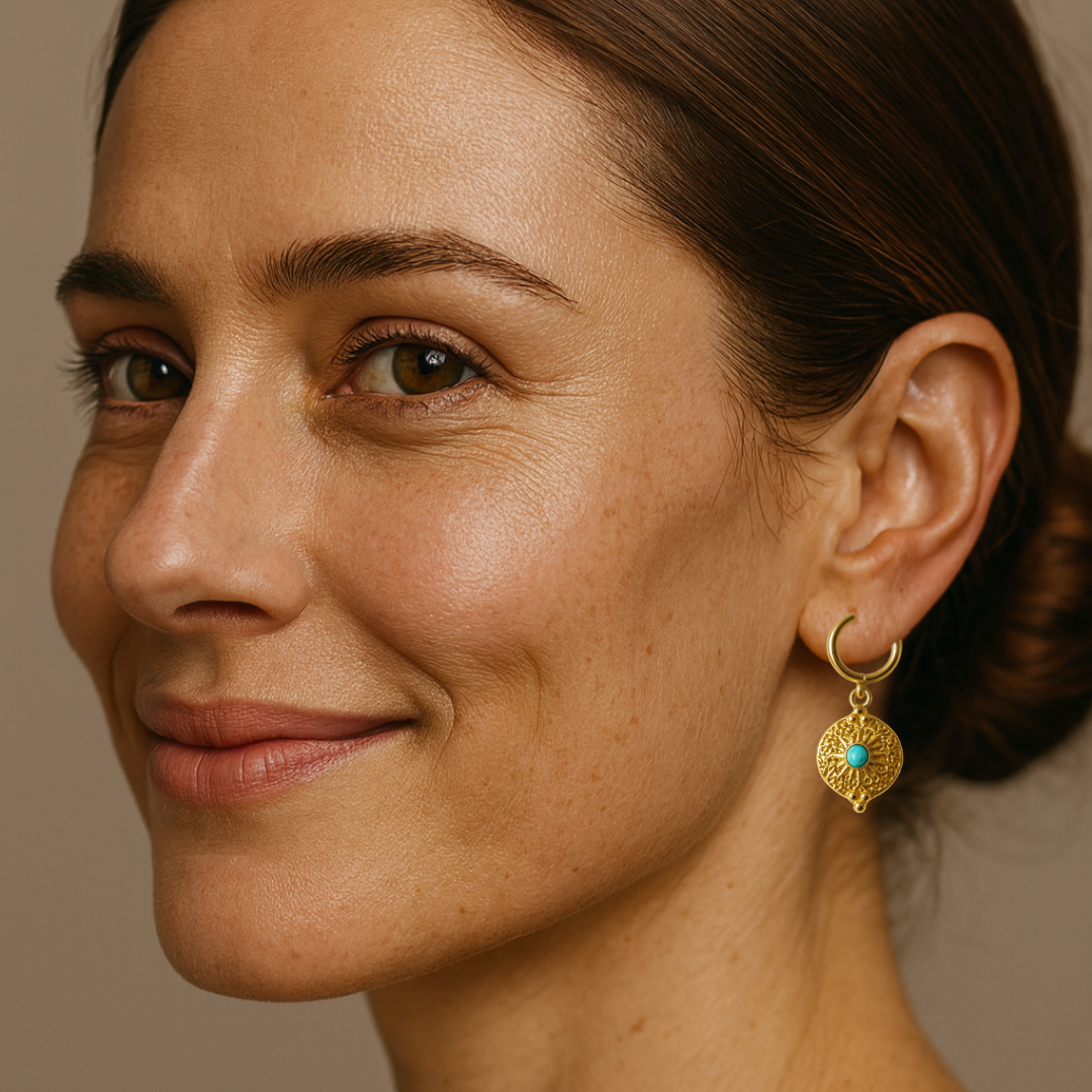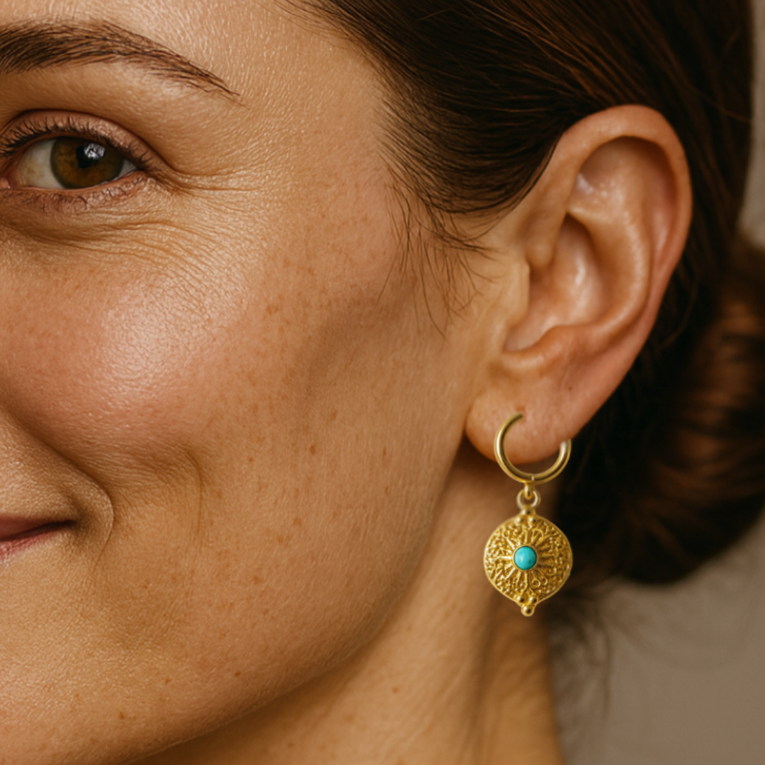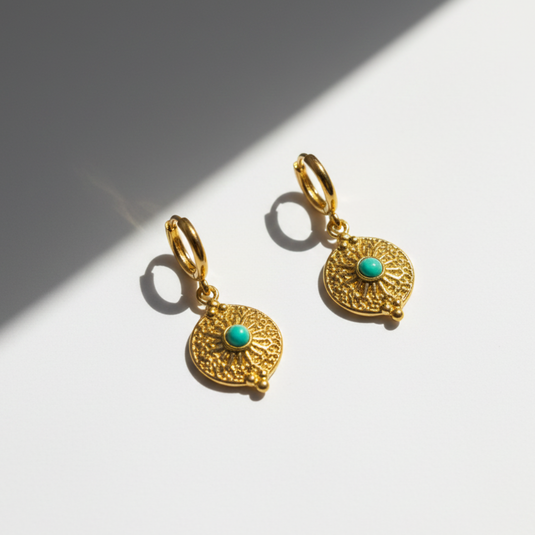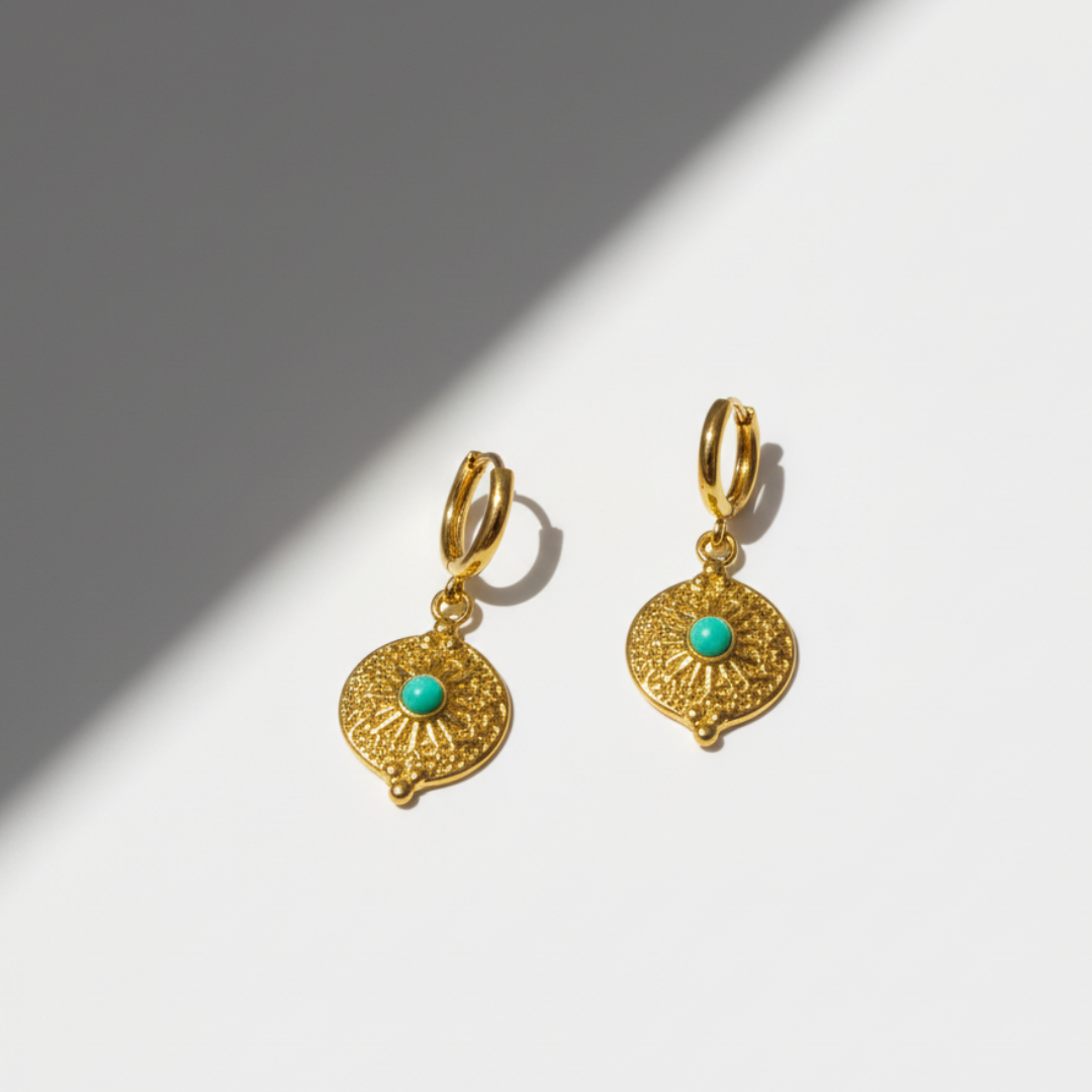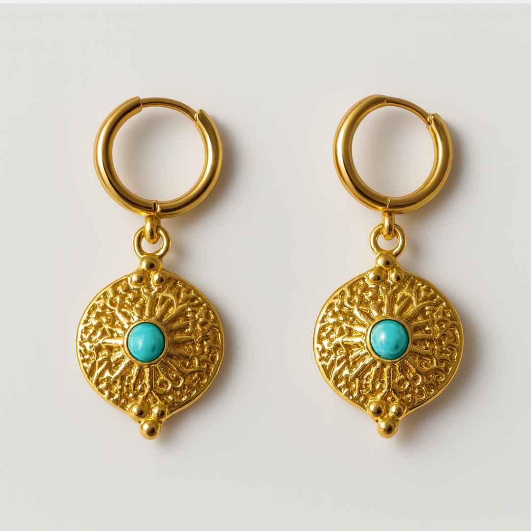 Estos pendientes dorados destacan por un diseño marcado por los detalles y un acabado que transmite carácter y delicadeza a la vez. La pieza central, con textura orgánica y líneas esculpidas, enmarca una piedra en tono turquesa que aporta un contraste fresco y luminoso.