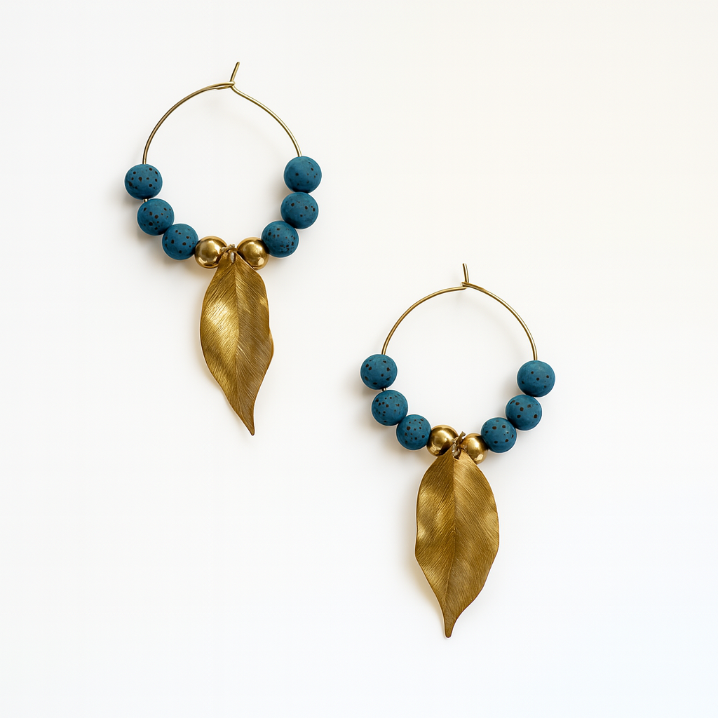 Gli orecchini Mia sono un perfetto connubio tra forza naturale ed eleganza contemporanea. Il loro design combina pietre vulcaniche blu petrolio con una foglia in acciaio inossidabile dorato e testurizzato che pende con grazia.