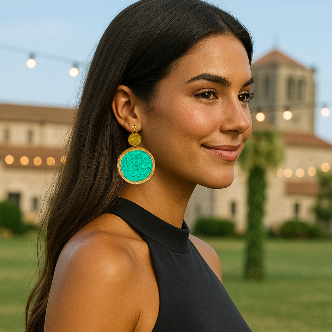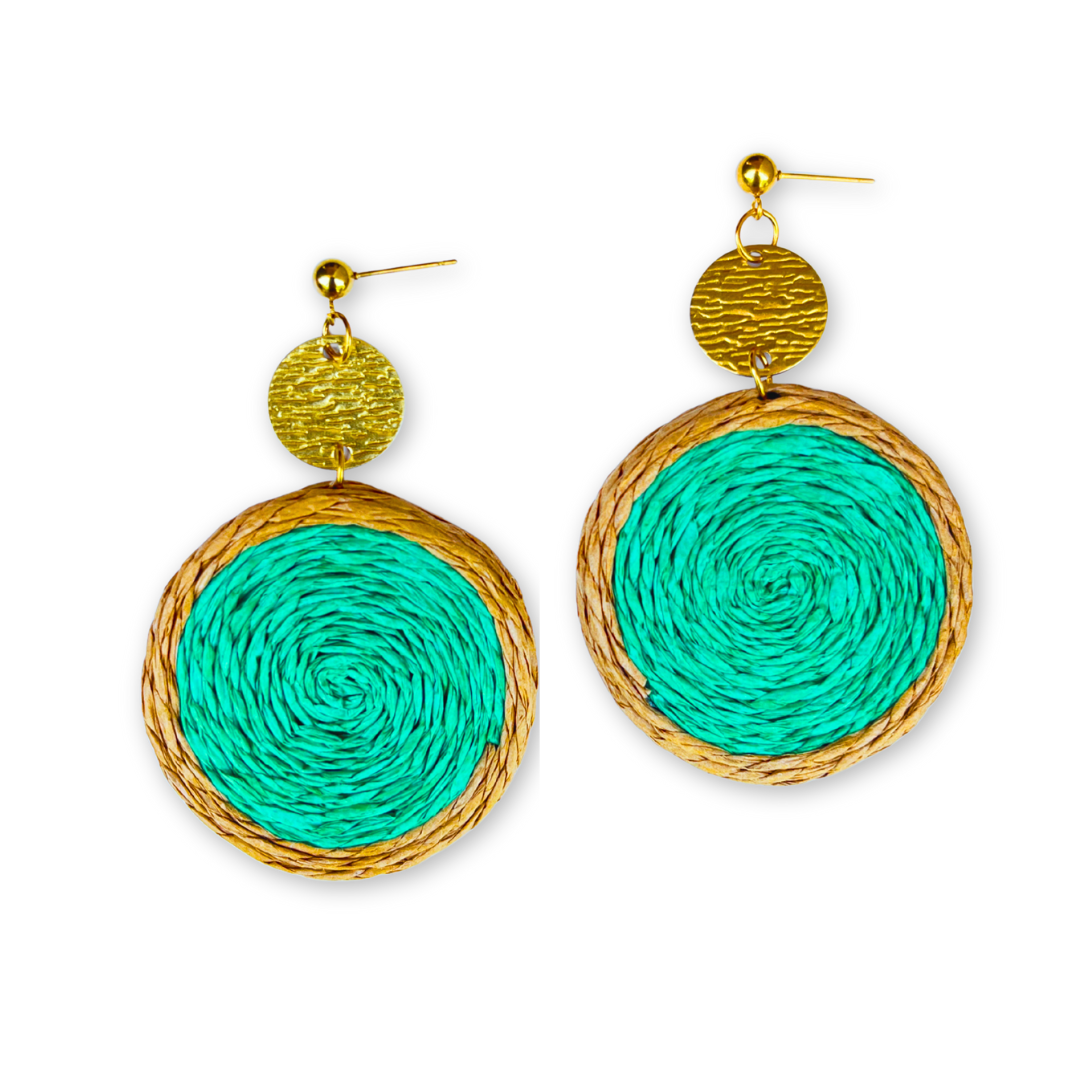 - Design: Disco in oro testurizzato + cerchio in rafia naturale intrecciata turchese