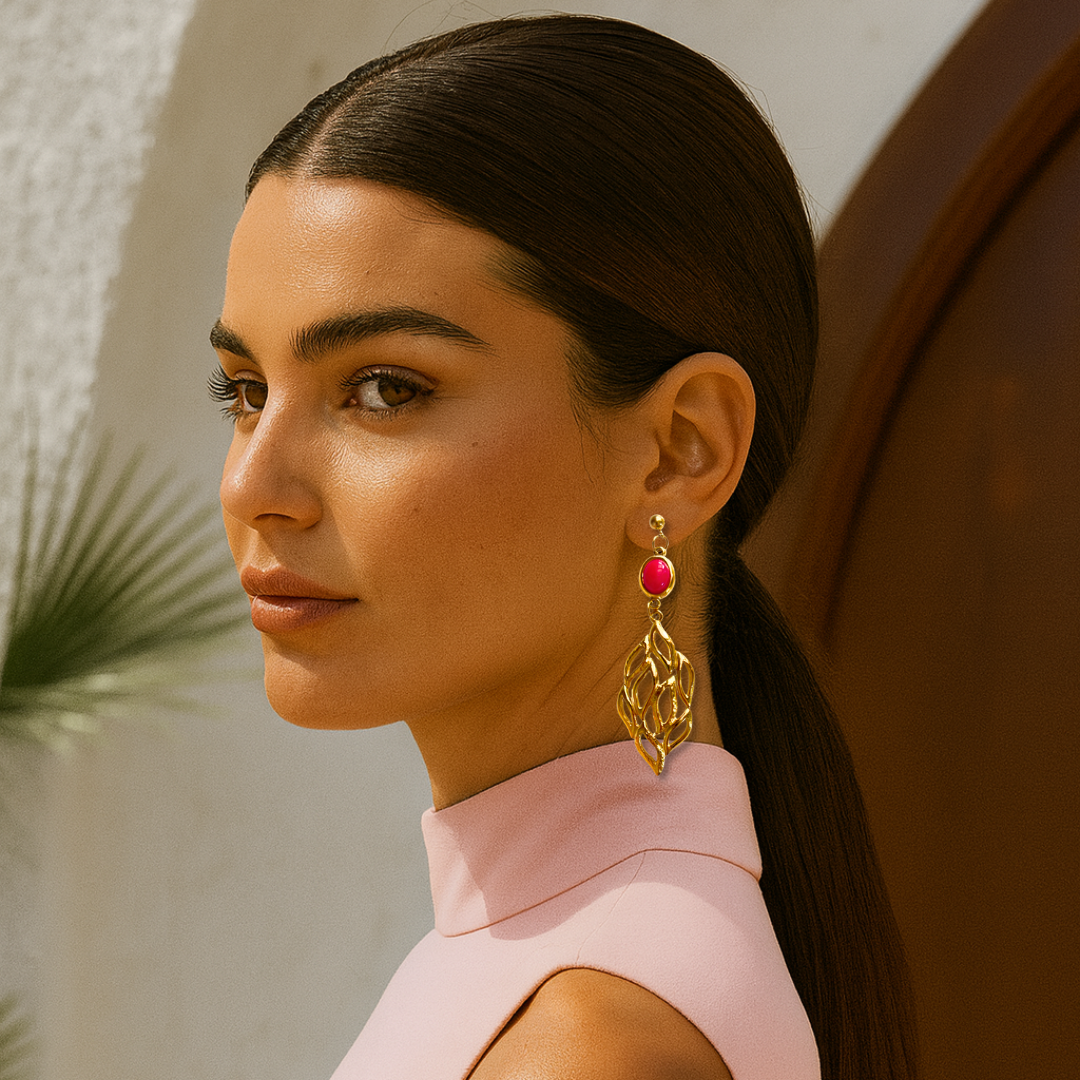 Gli orecchini Valentina hanno tutto: un dinamico design in oro, pietre colorate in cinque tonalità (bouganville, fucsia, bianco, blu e lilla) e una presenza leggera ma elegante. Perfetti per matrimoni, eventi e moderni stili flamenco.