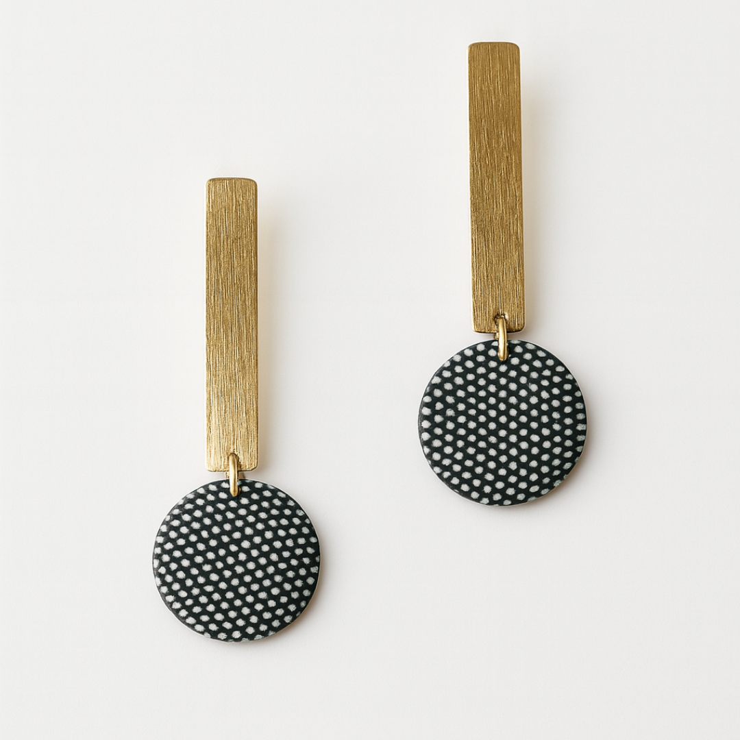 Los pendientes Zala combinan líneas doradas con un colgante redondo de arcilla polimérica en estampado minimalista. Un diseño ligero, moderno y con mucha personalidad, perfecto para elevar cualquier look sin esfuerzo. Elegantes, distintos y súper combinables.