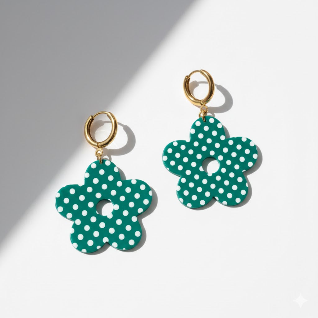 Zaya es una pieza divertida y con mucha personalidad. Estos pendientes de aro combinan una flor verde con lunares blancos que aporta un toque retro irresistible. Son ligeros, cómodos y perfectos para elevar cualquier look con un guiño fresco y diferente.